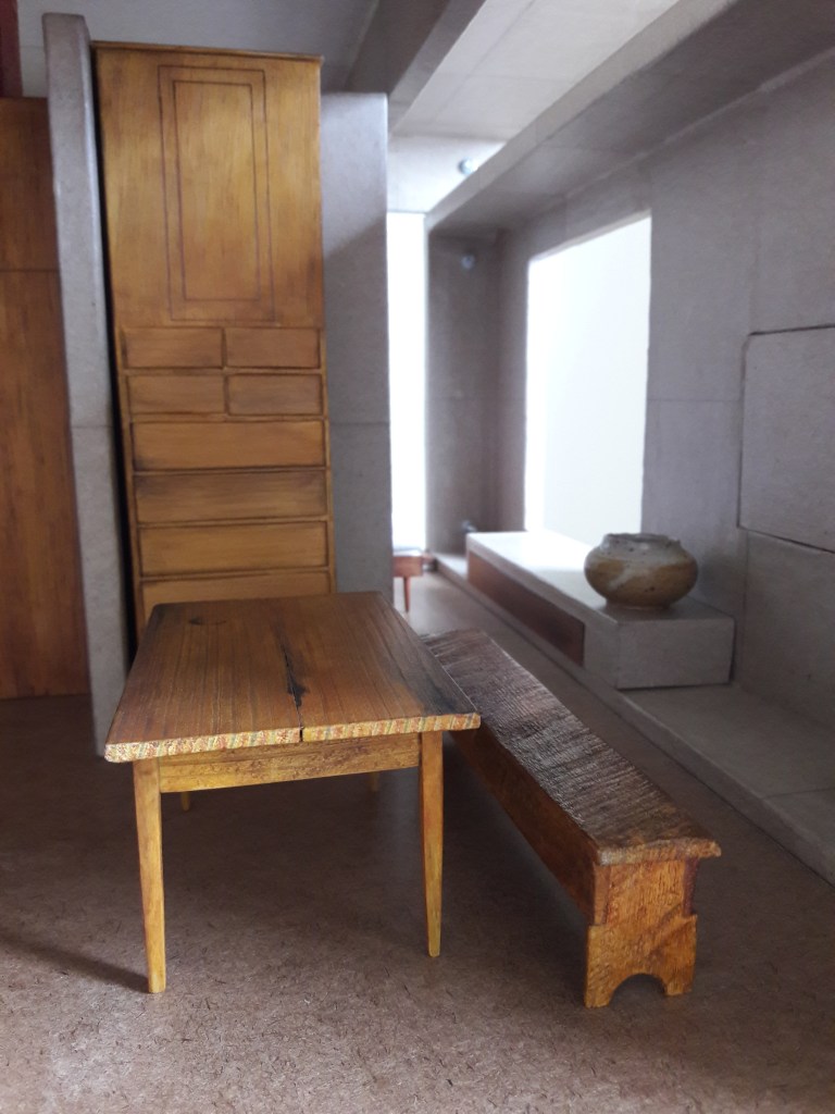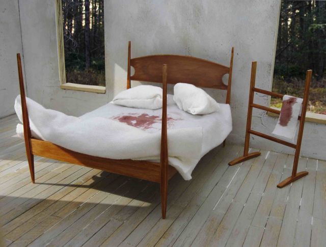 A darker piece, by far, than the whimsical iPad cinema. I made this piece at 1:12 scale, so it’s an unsettling sort of doll house. The floorboards are popsicle sticks with the rounded ends cut off. I made the Shaker furniture, too. A laboring woman has been here, and her new baby. Who else was here, and where is everyone now?