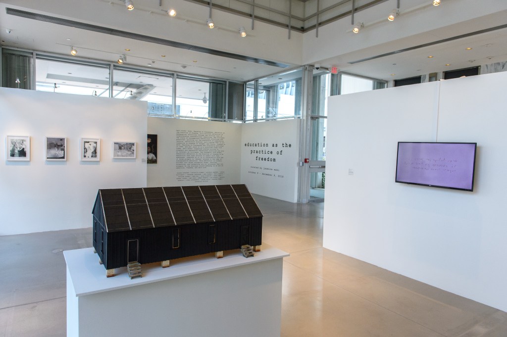 An old, black and white photograph of a prison barracks inspired this piece, seen on a pedestal in the foreground. I painted this piece realistically, but it looked too much like a work by American photographer and sculptor William Christenberry. The black paint takes the piece elsewhere — it’s realistic, but not. I exhibited it at the YoungArts Gallery in Miami, seen here. (Photo by Jason Koerner, used with permission.)