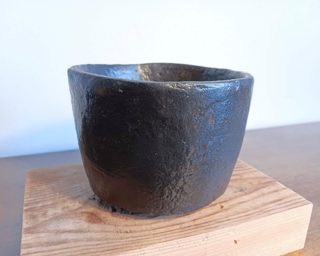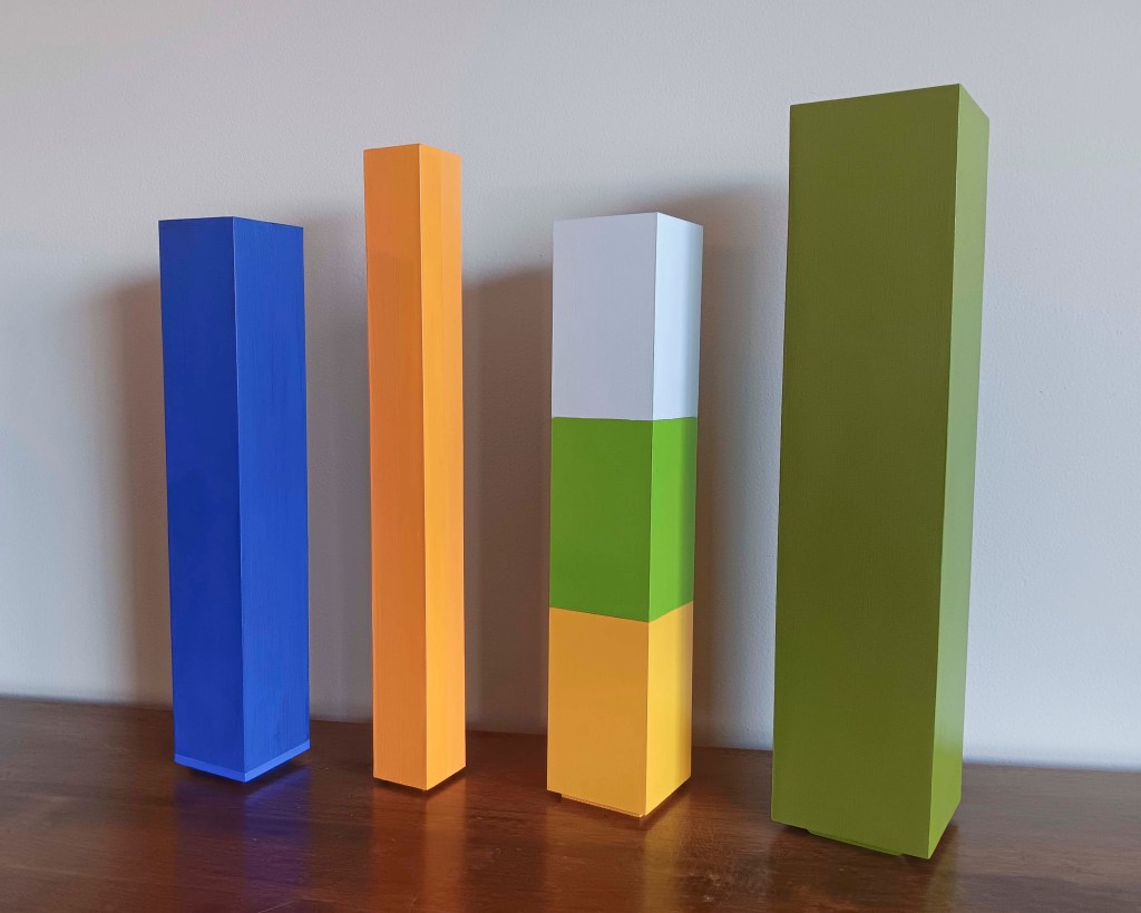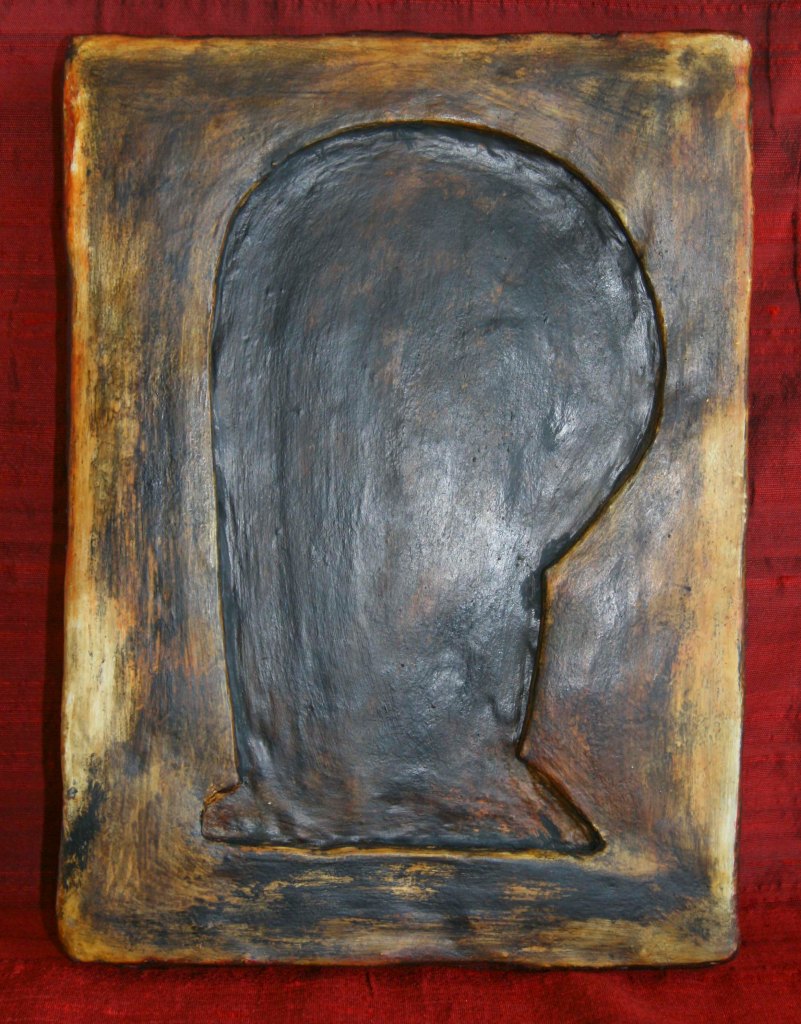 Centuries of candle soot obscure the face of a religious icon. There’s also a Japanese tea bowl, and four, quarter-size replicas that I made of sculptures by American artist and writer Anne Truitt. From the left, Morning Child (1973), Swannanoa (2002), A Wall for Apricots (1968), and Pith (1969). The Anne Truitt replicas aren’t old like the other pieces on this page, but they are part of my collection of art that is, in some way, removed from the real thing.