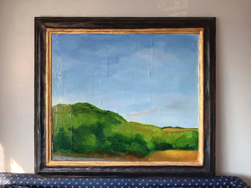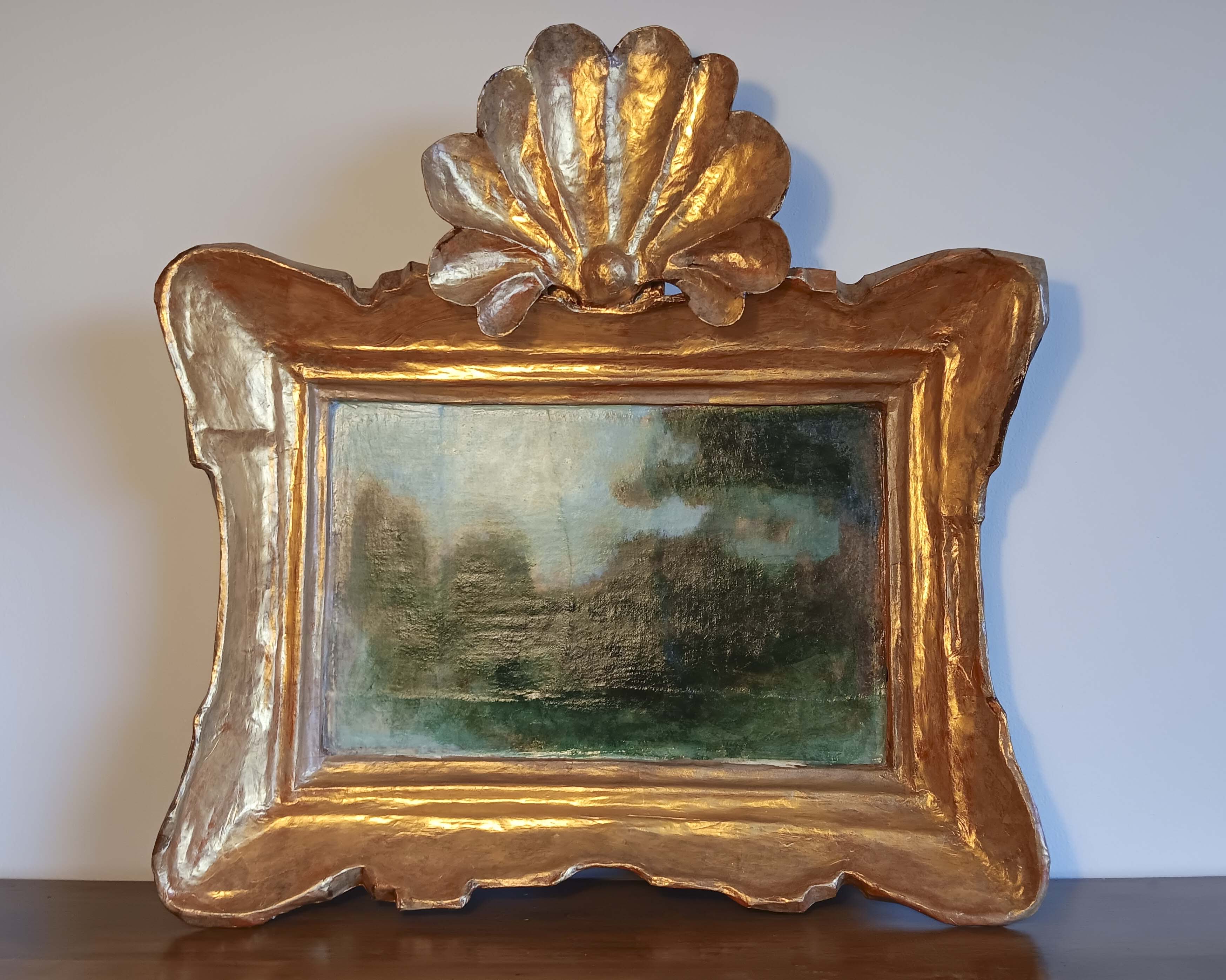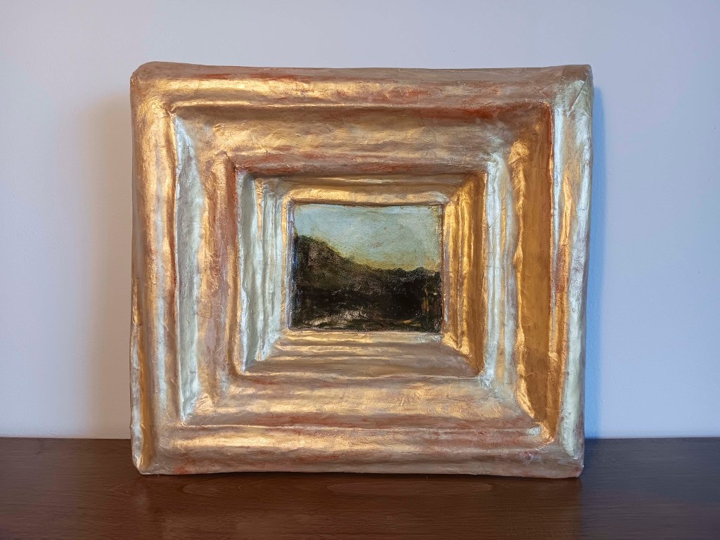 The piece with the big, gold shell on top is a pretend, 18th Century French landscape. I work at a grocery store and made this piece out of a grape box. I cut the corners, pushed out the sides, and added the rest. The big landscape in the black frame ended up looking a lot like the landscapes near which I grew up, in Southwestern Wisconsin. I think of this as a painting by one of those 19th Century Americans who used three names, like Frederick Edwin Church or John Singer Sargent.