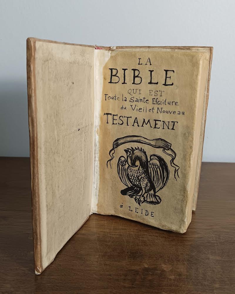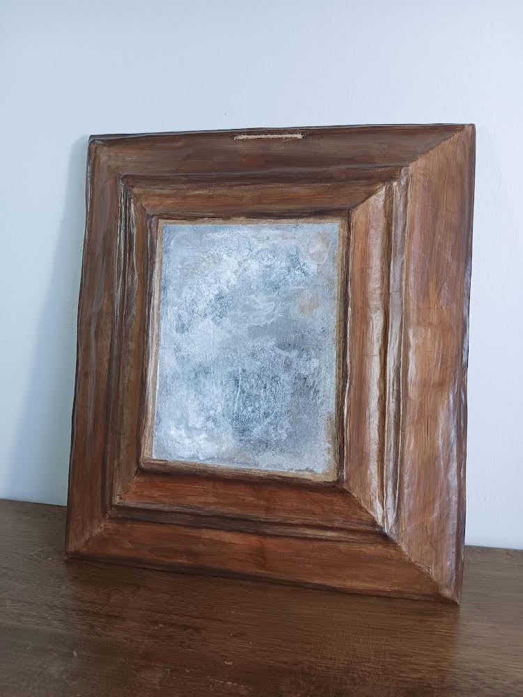 The piece with a natural wood frame is a Huguenot mirror. In times of persecution, French Protestants, or Huguenots, hid forbidden books in these mirrors. I made a French language Bible to go with my mirror. The Bible fits in the back of the mirror, behind a removable panel.